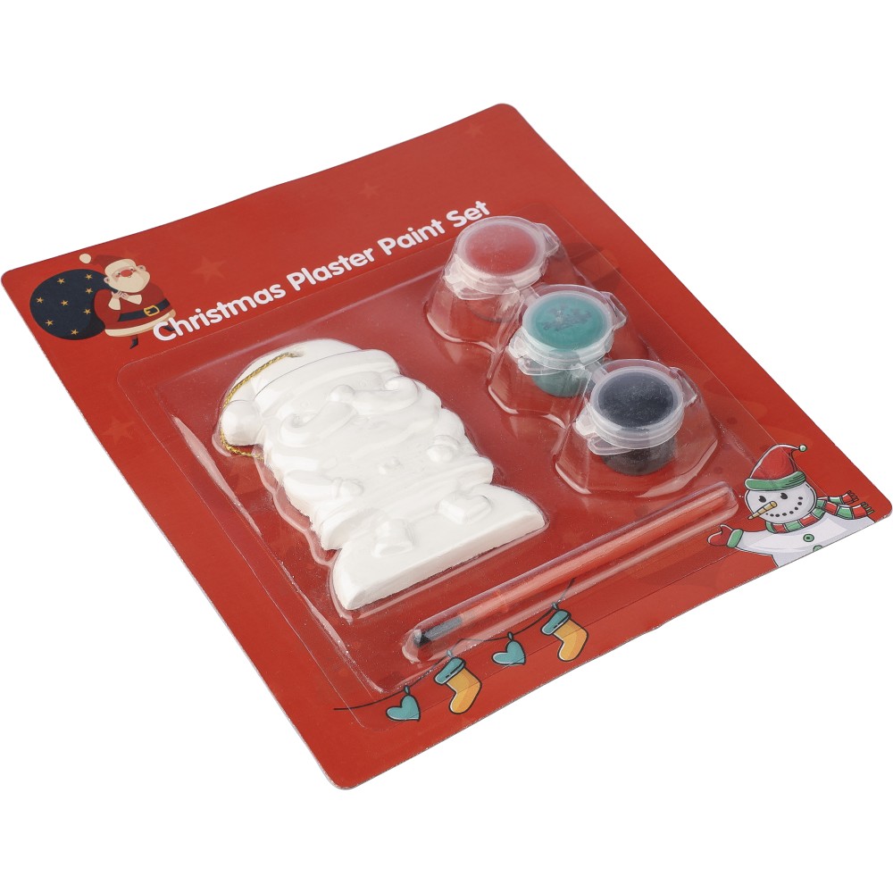 Mikulás festőkészlet, amely tartalmaz egy gipszfigurát, három különböző színű akrilfestéket és egy ecsetet. A figurát a rajta található lyukon keresztül poliészter zsinórral lehet karácsonyfadíszként felakasztani.