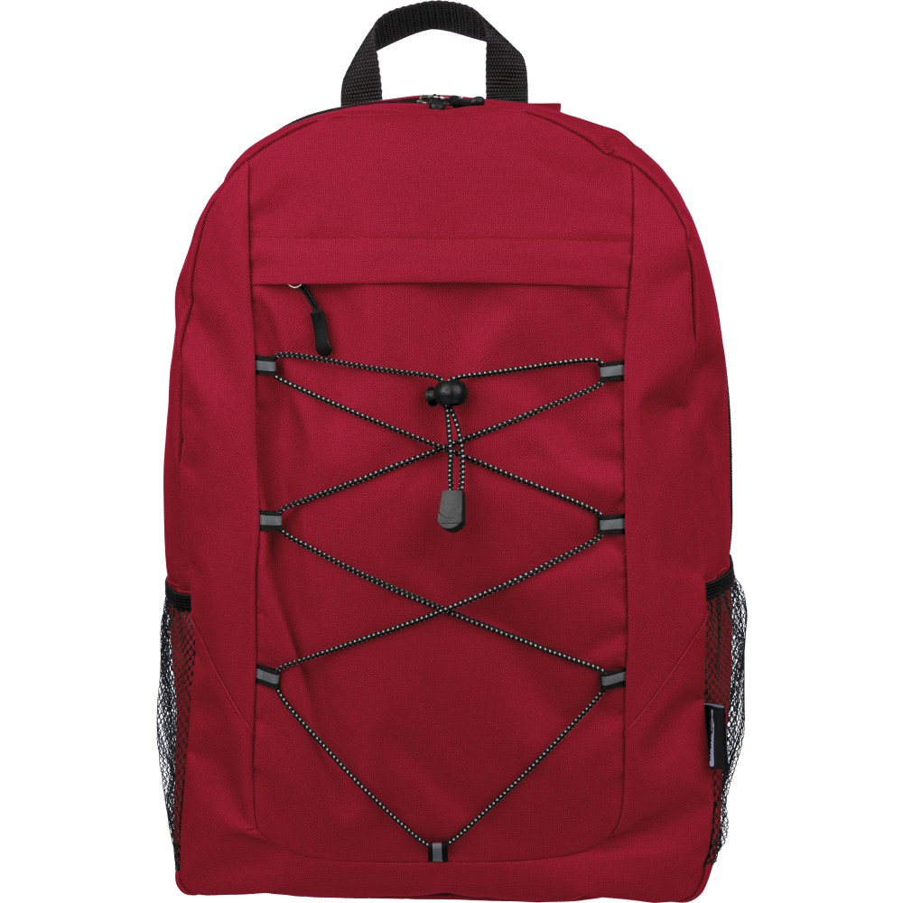 RPET poliészter 600D anyagból készült hátizsák húzózsinóros záródással és nagy cipzáras fő rekesszel. Hálós oldalzsebekkel, rugalmas elülső pántokkal, dekorációhoz kialakított kis elülső cipzáras zsebbel és állítható vállpántokkal rendelkezik. A terméken rPET alapanyagra utaló címke található.