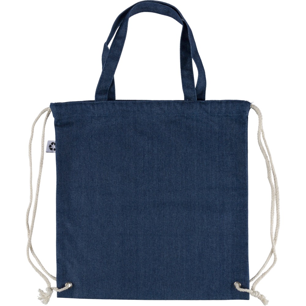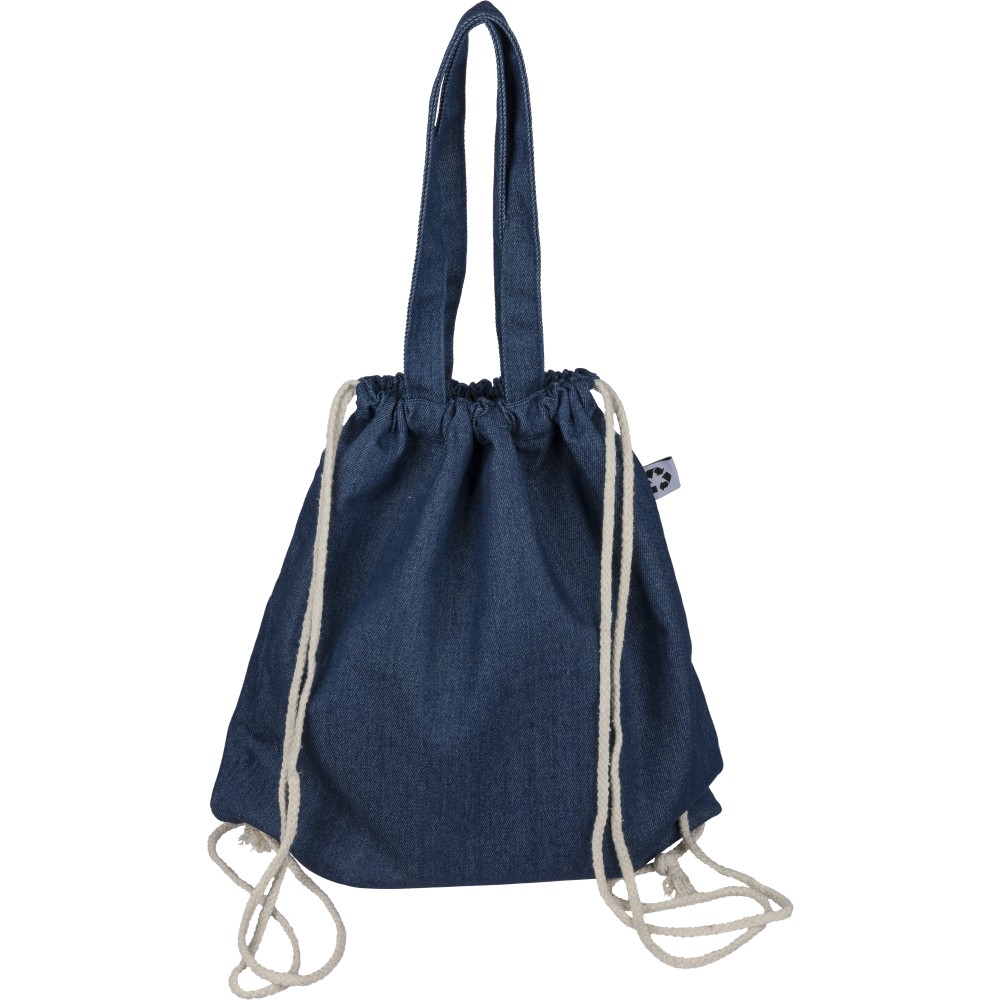 Újrahasznosított farmeranyagból készült húzózsinóros táska 40 × 38 cm méretben, 2,5 × 50 cm hosszúságú fülekkel és húzózsinóros záródással. A külső felületen újrahasznosított alapanyagra utaló címke található, vállpántként vagy kézi hurokként is hordható.