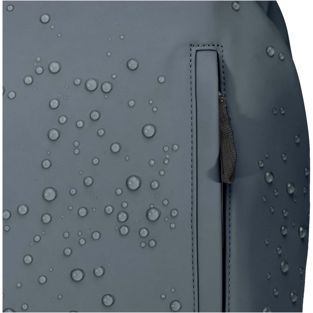 A prémium minőségű, GRS tanúsítvánnyal rendelkező újrahasznosított PU bőrből készült, színben passzoló RPET béléssel ellátott 15?-os biztonsági hátizsák garantálja az értékek védelmét és szárazon tartását útközben. A termék hátulról hozzáférhető laptoprekeszel, két letisztult oldalsó zsebbel, valamint egy vízálló cipzárral felszerelt elülső zsebbel rendelkezik. A légáteresztő hátlap biztosítja az egész napos kényelmet, így ideális választás ingázáshoz, utazáshoz vagy városi használatra. Űrtartalma: 18 liter.