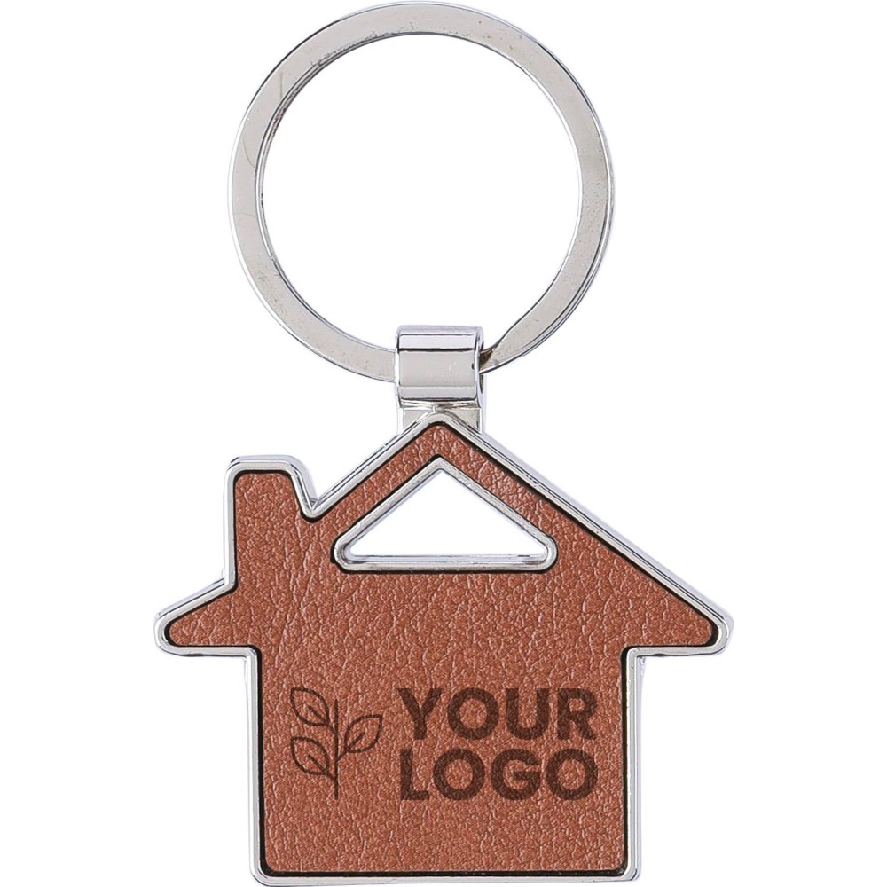 Kulcstartó ház alakú, újrahasznosított bőrből, fém karikával. Oldalán dombornyomott újrahasznosított bőr anyagra utaló logóval. Egyenként barna kartonhüvelybe csomagolva. Anyaga: újrahasznosított bőr.