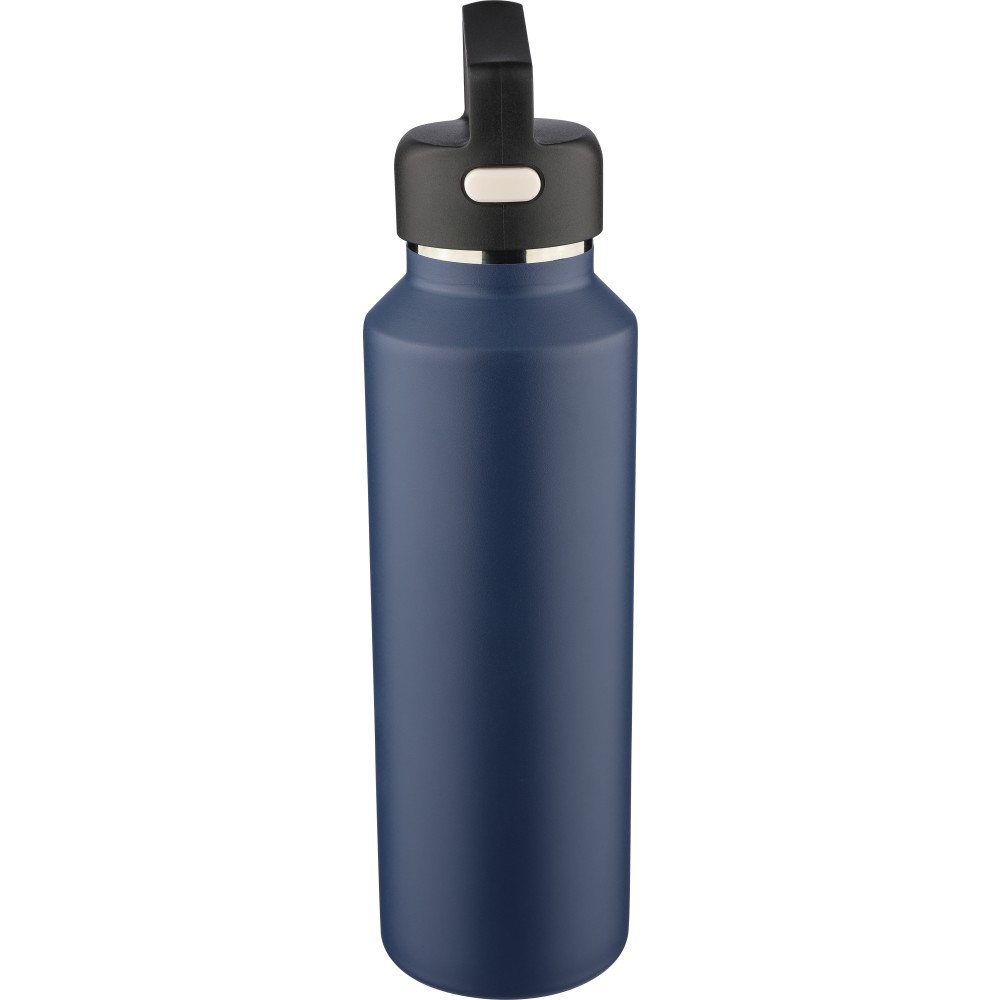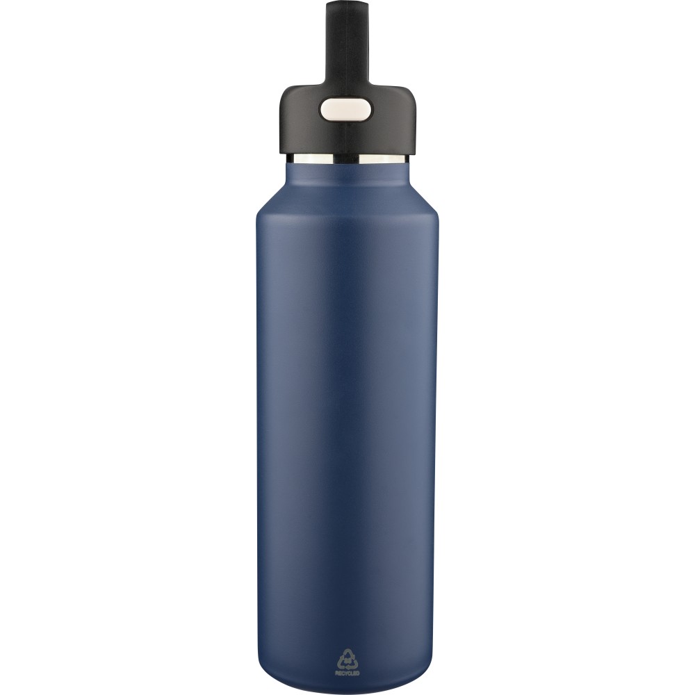 Újrahasznosított rozsdamentes acélból készült, vákuumszigetelésű palack 600 ml űrtartalommal, duplafalú kialakítással, hordozófüllel ellátott PP fedéllel és kétféle (dupla) nyitási lehetőséget biztosító nyomógombos rendszerrel. A palacktesten lézergravírozott recycled (újrahasznosított) alapanyagra utaló logó található. Darabonként barna kartondobozba csomagolva.